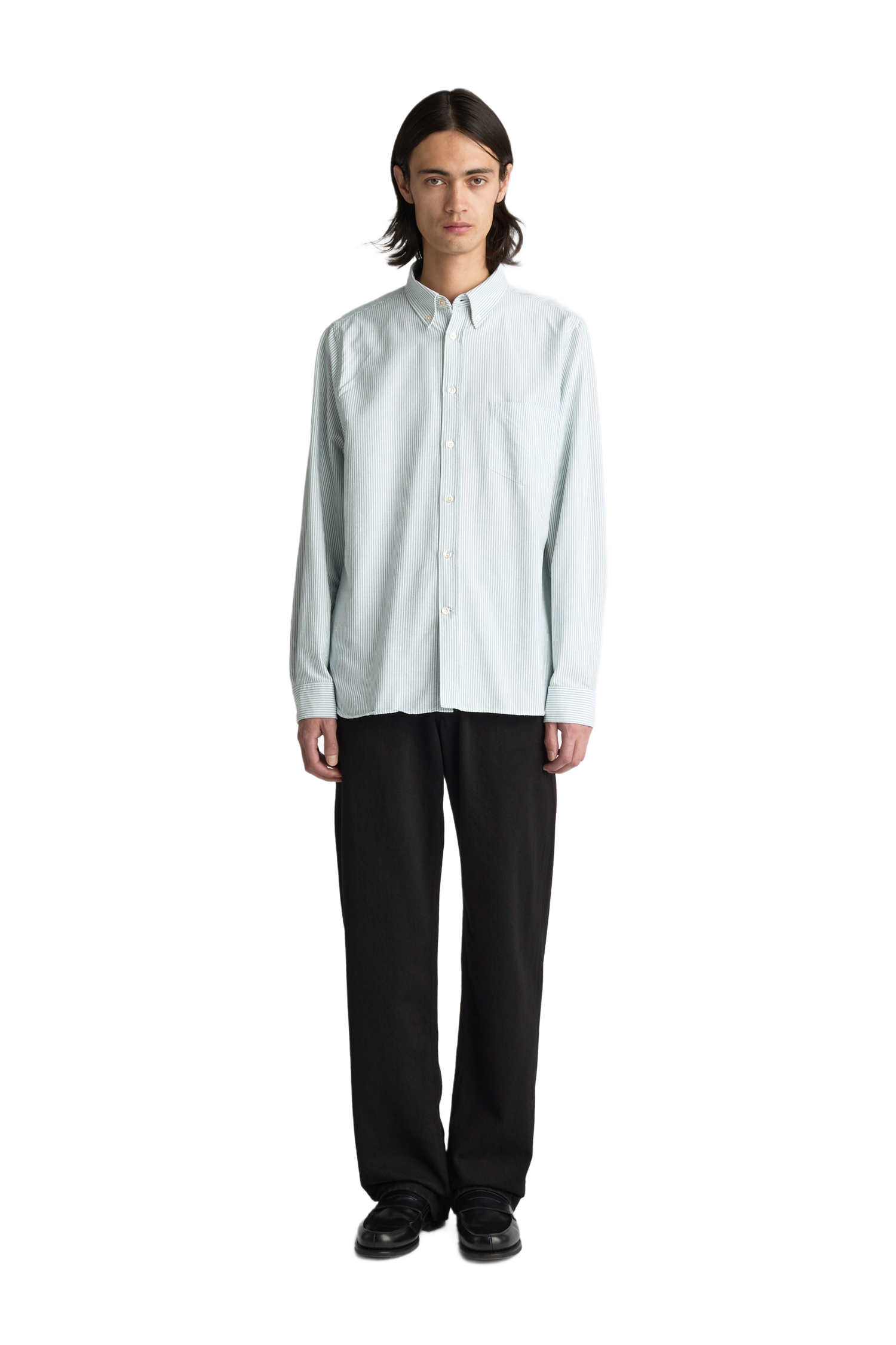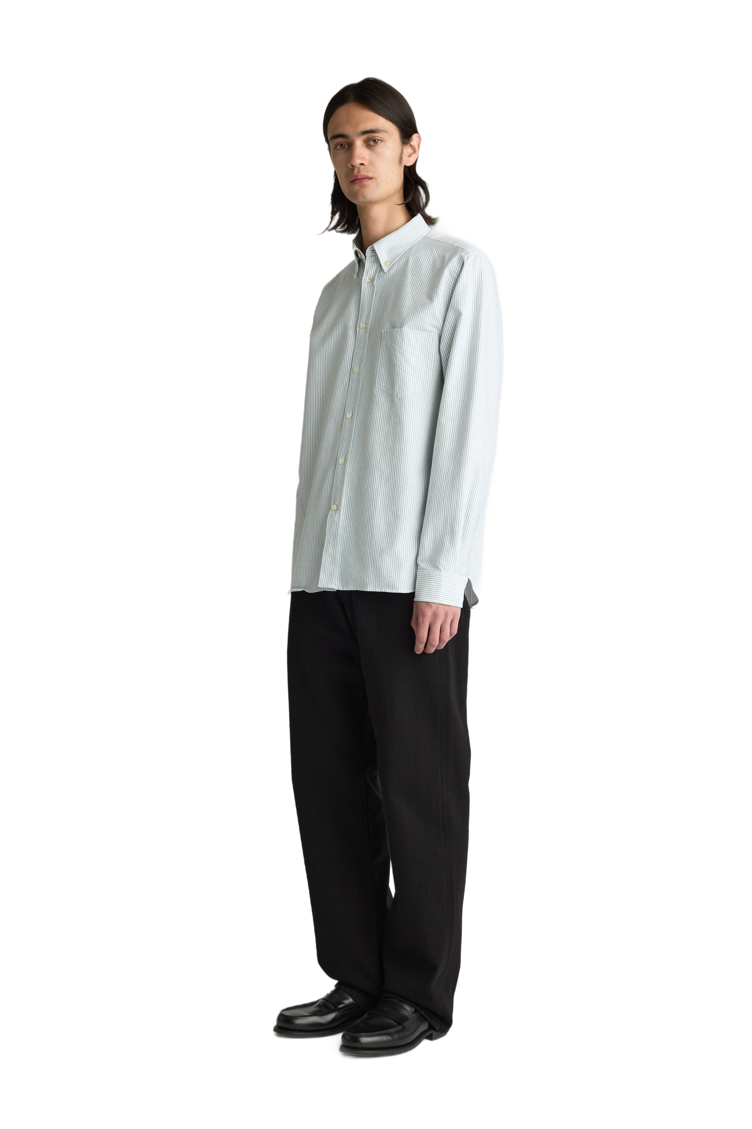 Initial Green Candystripe fra Livid er en klassisk oxford-skjorte med et friskt striperutemønster. Med button-down krage og røff, allsidig look — perfekt både under blazer og alene når det skal være stilrent.