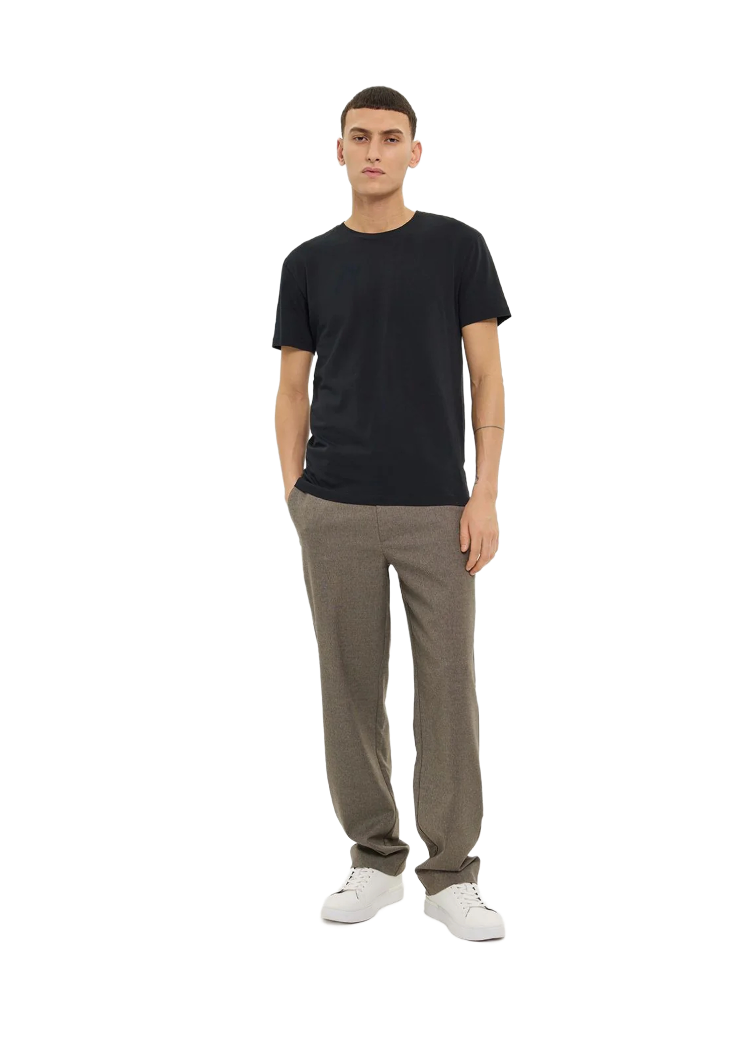 Oppdag Plain Units OswaldPL 438 Mud Melange hos mandynorge – en moderne straight-fit bukse med raffinert melange-finish. Stoffet kombinerer resirkulert polyester, viskose og elastan for balanse mellom struktur og komfort. Buksen har mid-waist, flat front og innerlining i linningen for ekstra komfort, med hook-and-bar-lukking og glidelås. Passer perfekt til både fritid og mer formell hverdagsstil.