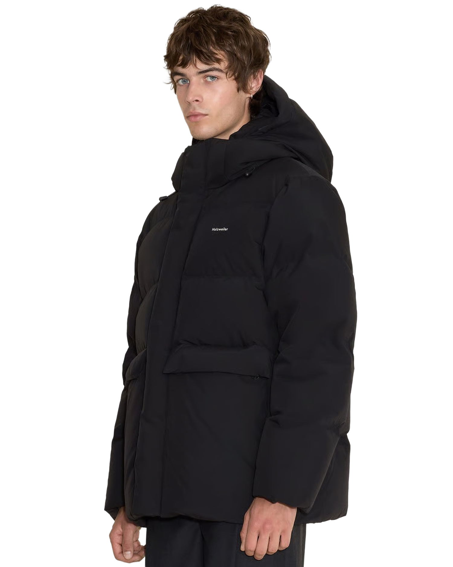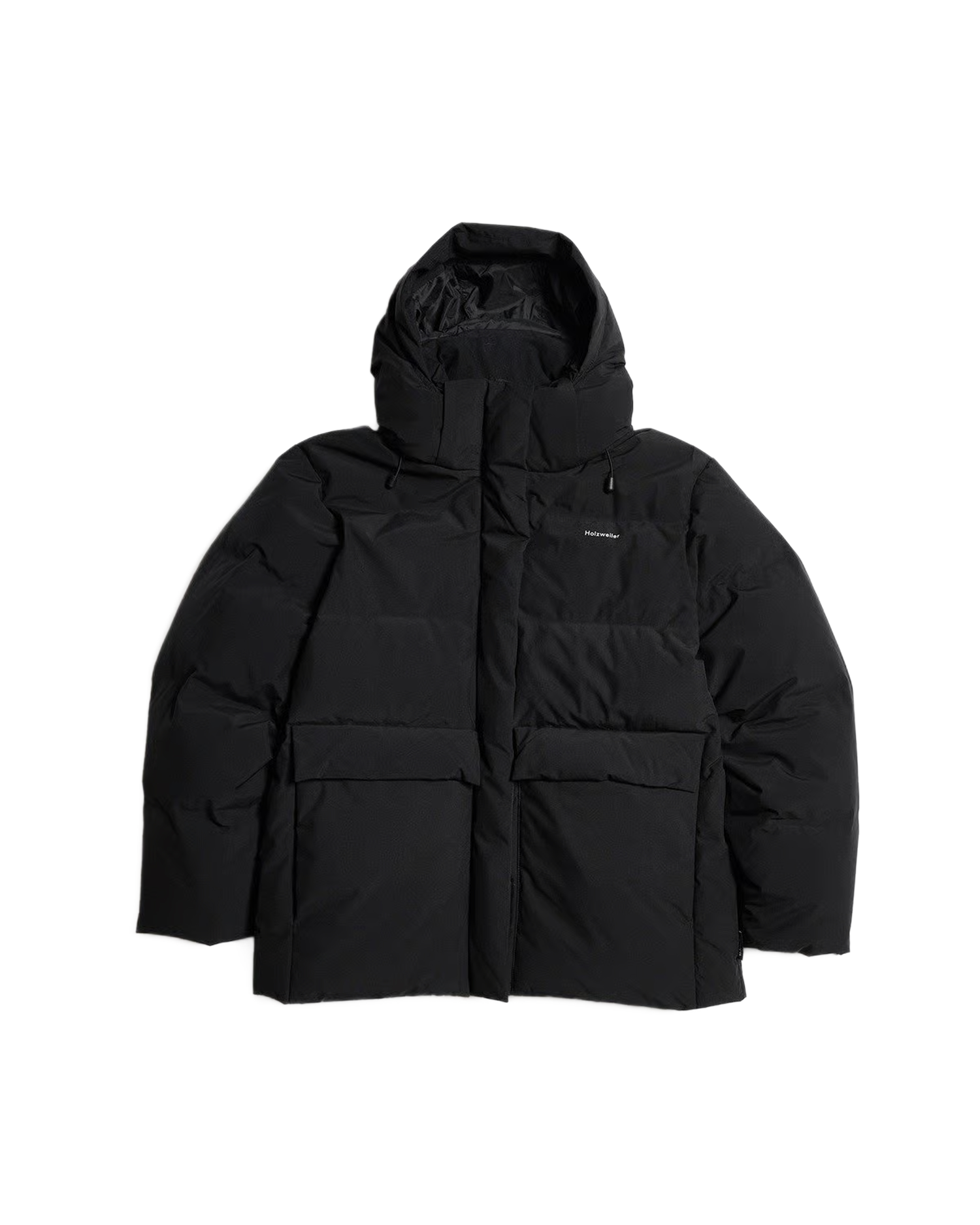 Holzweiler Dovre Down Jacket er en midtlengde dunjakke med oversize passform. Den er laget i teknisk ytterstoff med vannavvisende egenskaper og fylt med RDS-sertifisert dun. Jakken har en stor hette, toveis glidelås og praktiske lommer. En varm og funksjonell jakke for kalde dager.