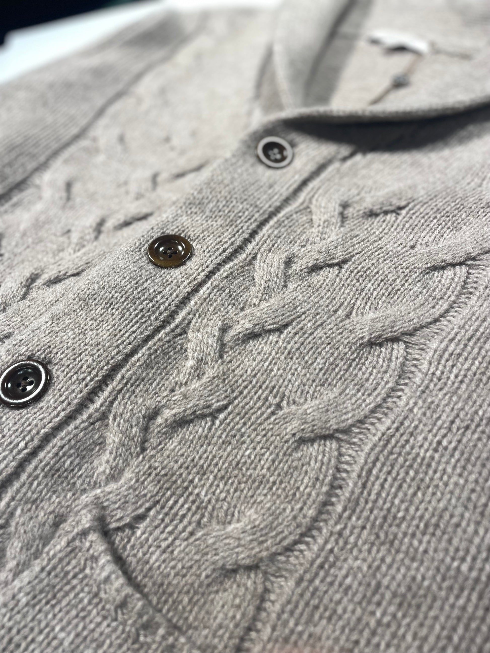 • Shawl-krage, frontknapping, kraftig flettet mønster i front, lommer i front.