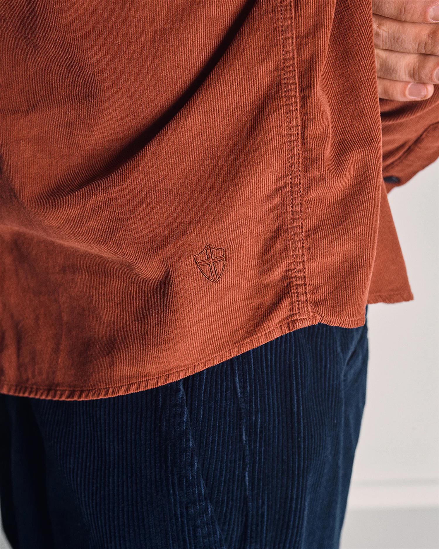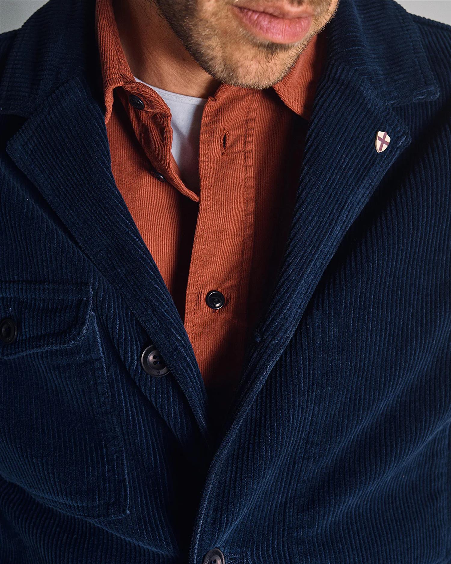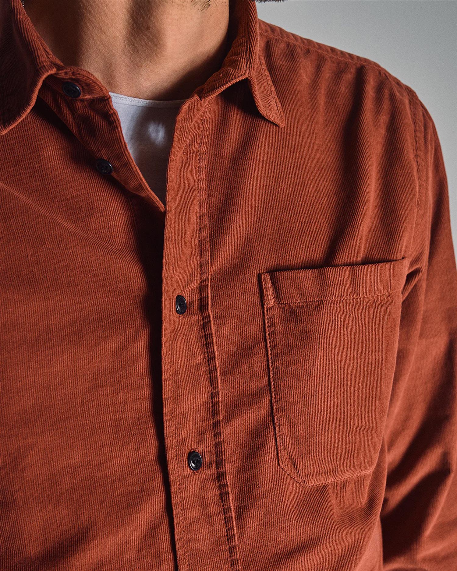 Zamboni Velu Shirt fra Blue de Gênes er en skjorte i baby-kord med i en rik farge og livlig tekstur. Med detaljer som corozo-knapper og får den et røft, men raffinert uttrykk – perfekt for lag-på-lag med grove strikker eller som standalone statement.