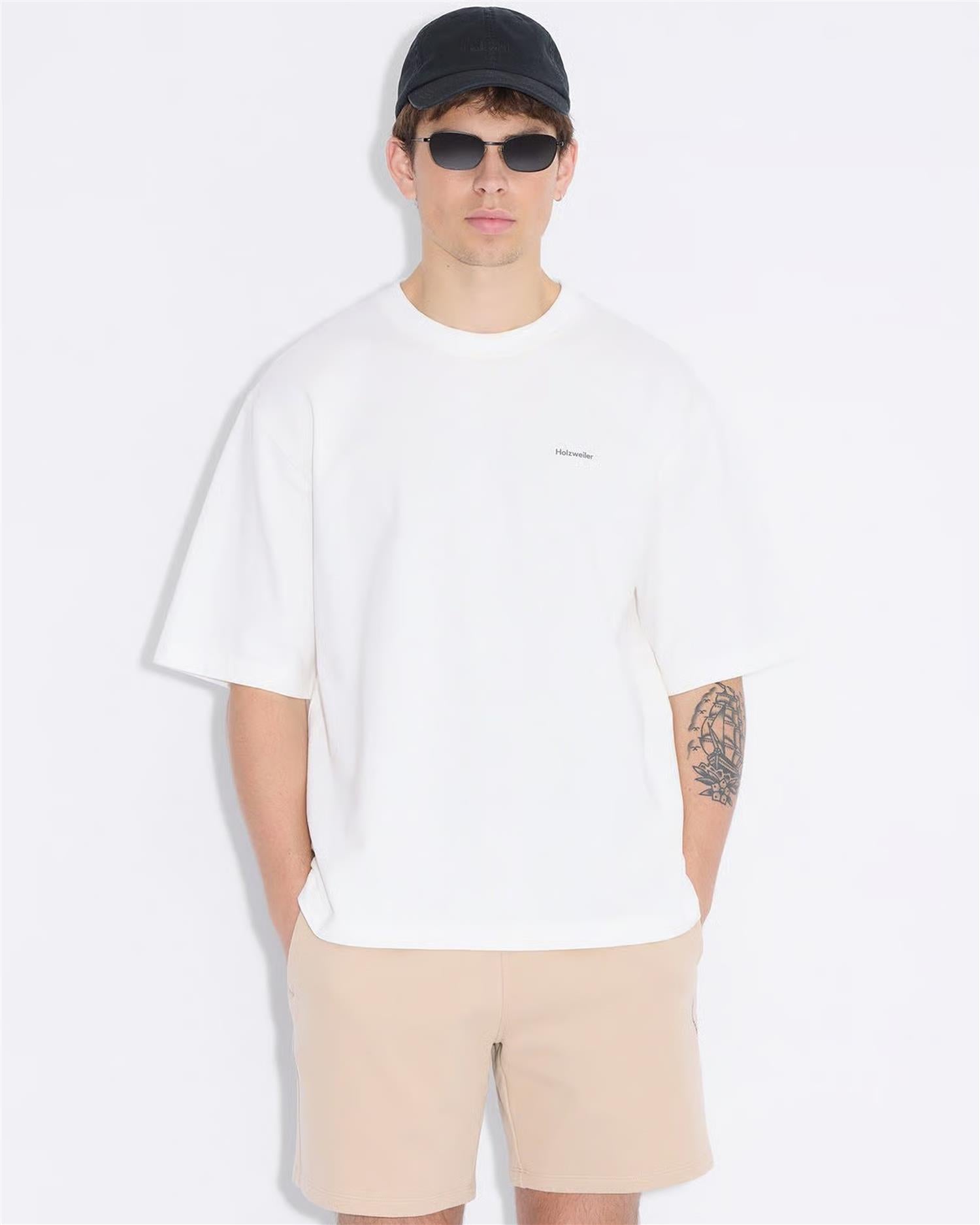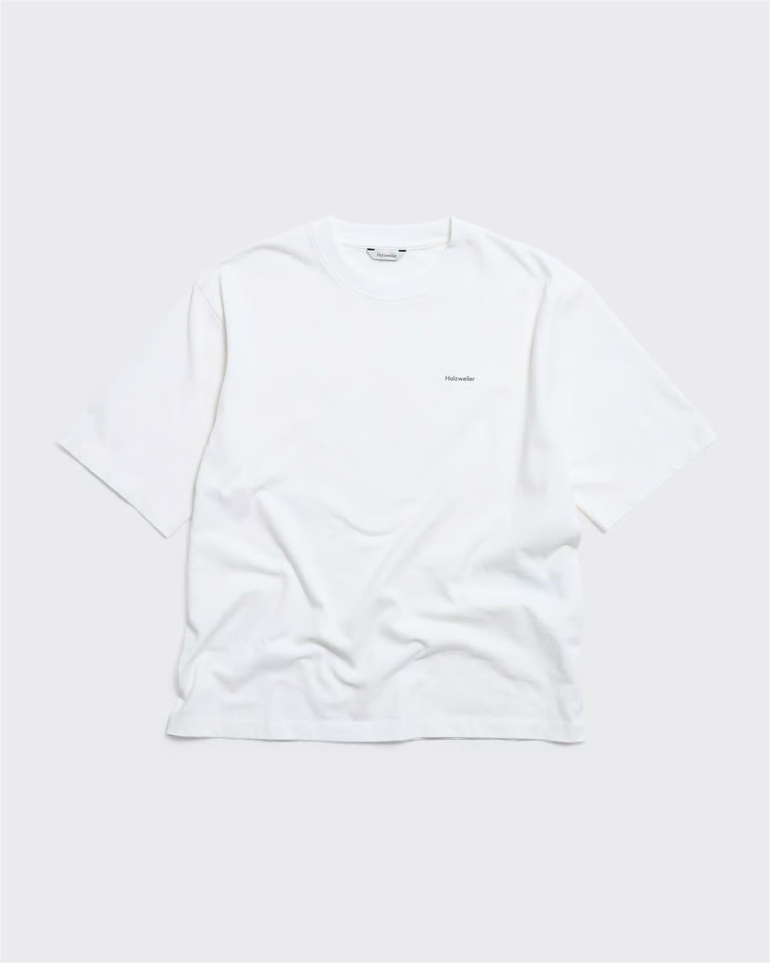 Holzweiler Relaxed Tee White er en minimalistisk og komfortabel T-skjorte laget av 100 % økologisk bomull. Den har en avslappet passform og en subtil Holzweiler-logo brodert på brystet, noe som gjør den til et allsidig plagg for en moderne og uformell stil.