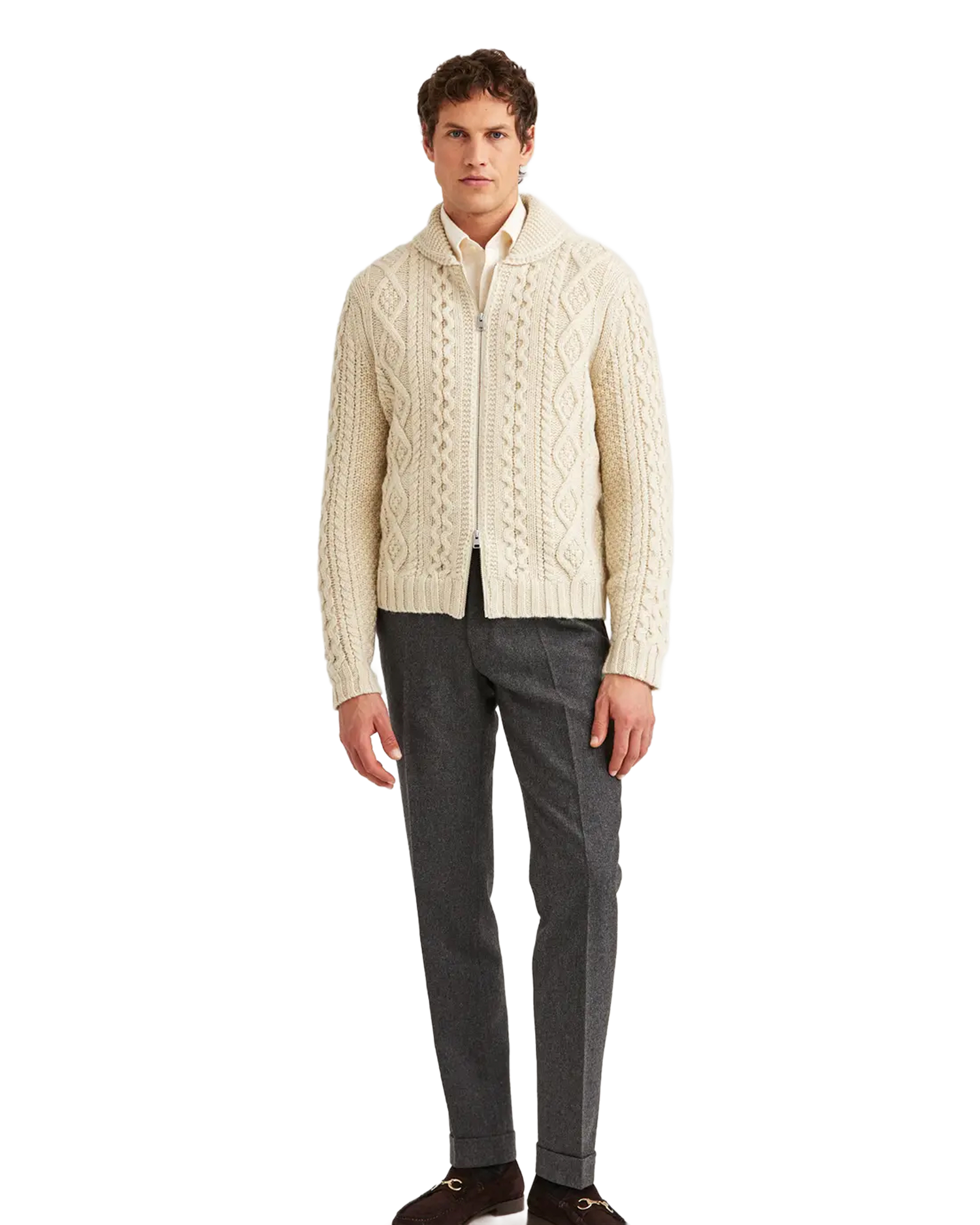 Cornwall Cable Zip Jacket hyller irsk kabelstrikktradisjon med moderne detaljer som hel glidelås og tykk ullkvalitet. En robust jakke som kombinerer estetikk og varme — perfekt som ytterplagg i overgangsvær eller som statement-lag i kulden.
