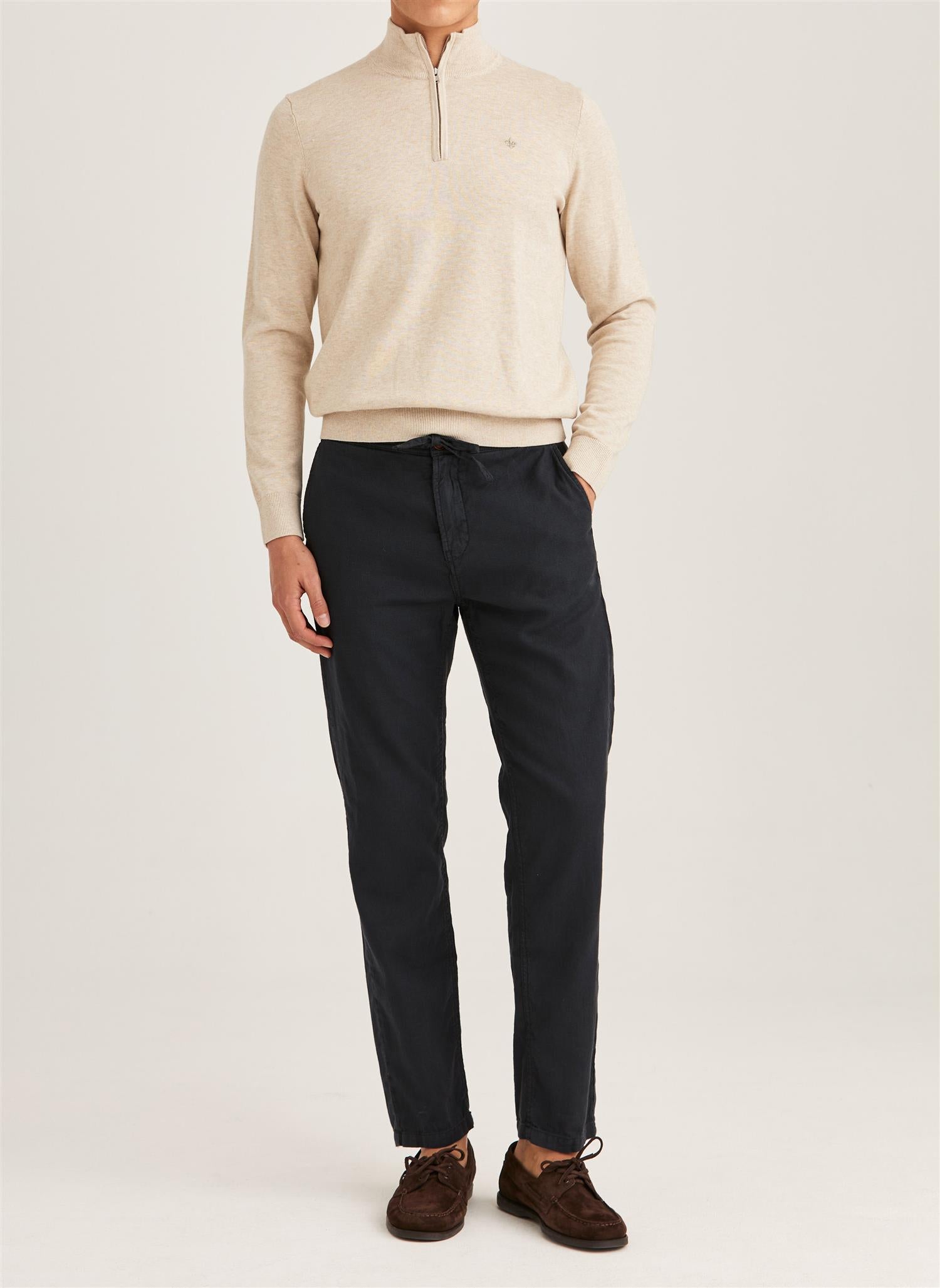 Morris Stockholm Fenix Linen Trouser er en lett og komfortabel sommerbukse med en avslappet, men sofistikert silhuett. Den har en regular fit med lett avsmalnende ben, og kombinerer en elastisk linning med snøring for optimal komfort. Perfekt for varme dager, enten du skal på ferie eller ønsker en stilig hverdagslook.