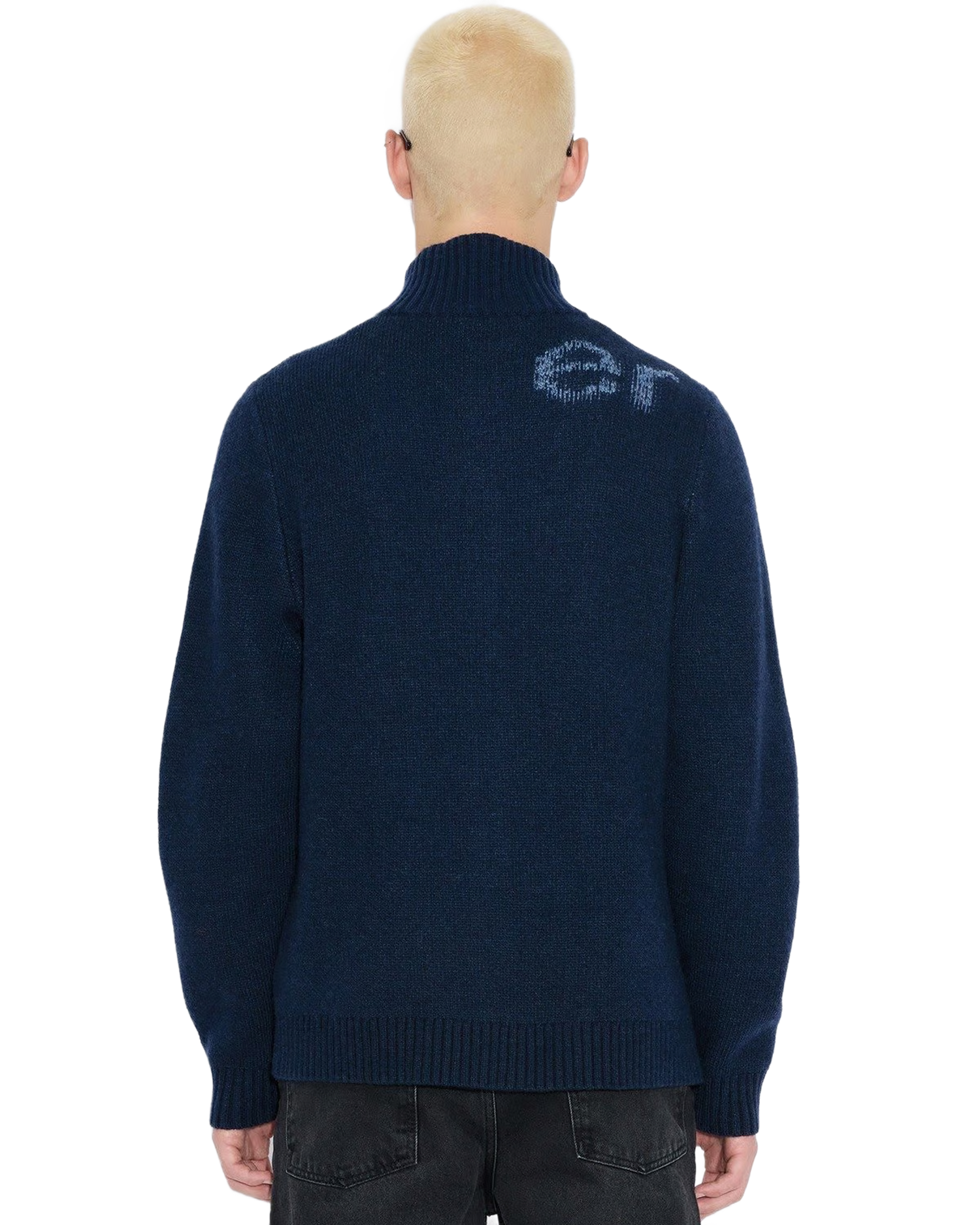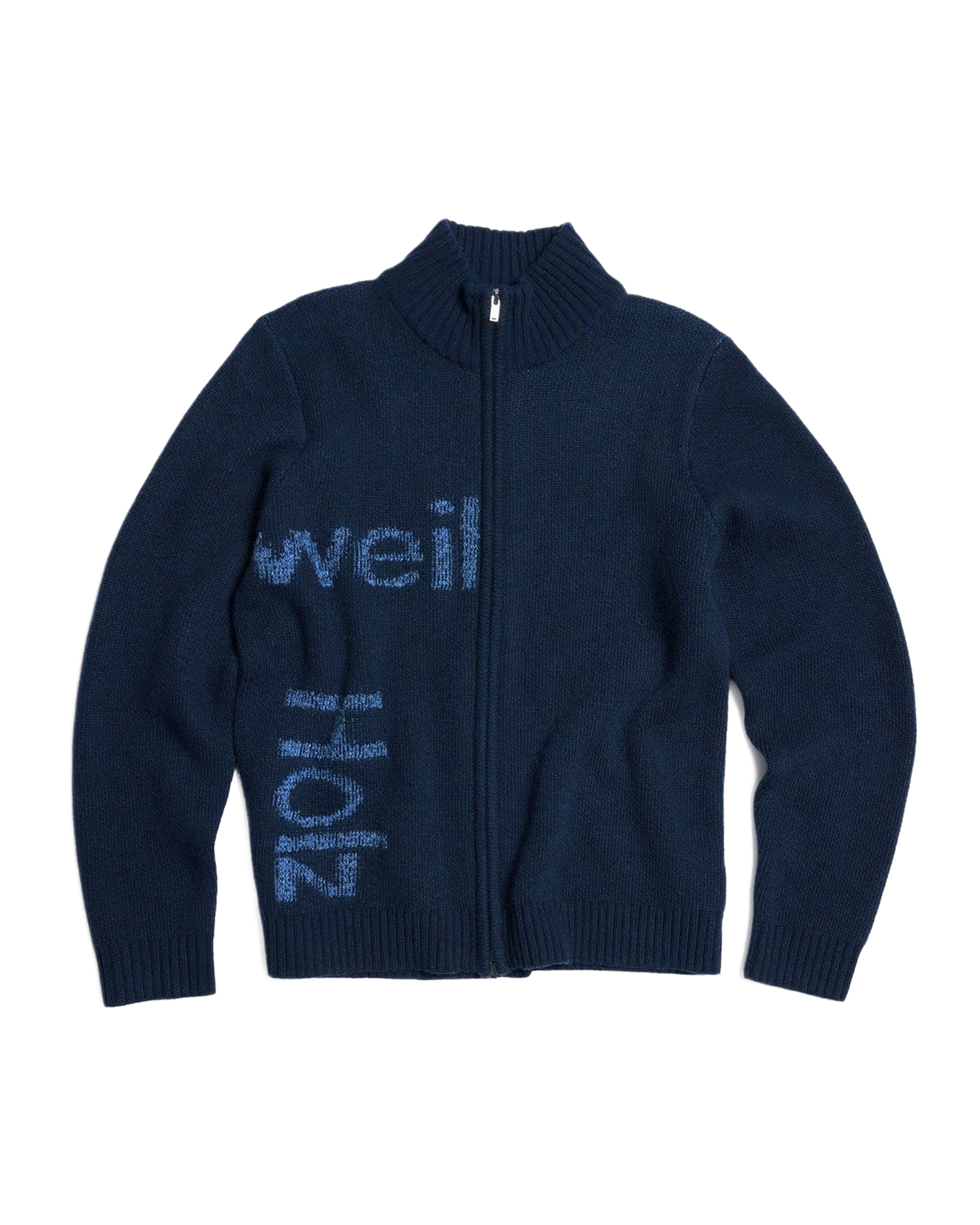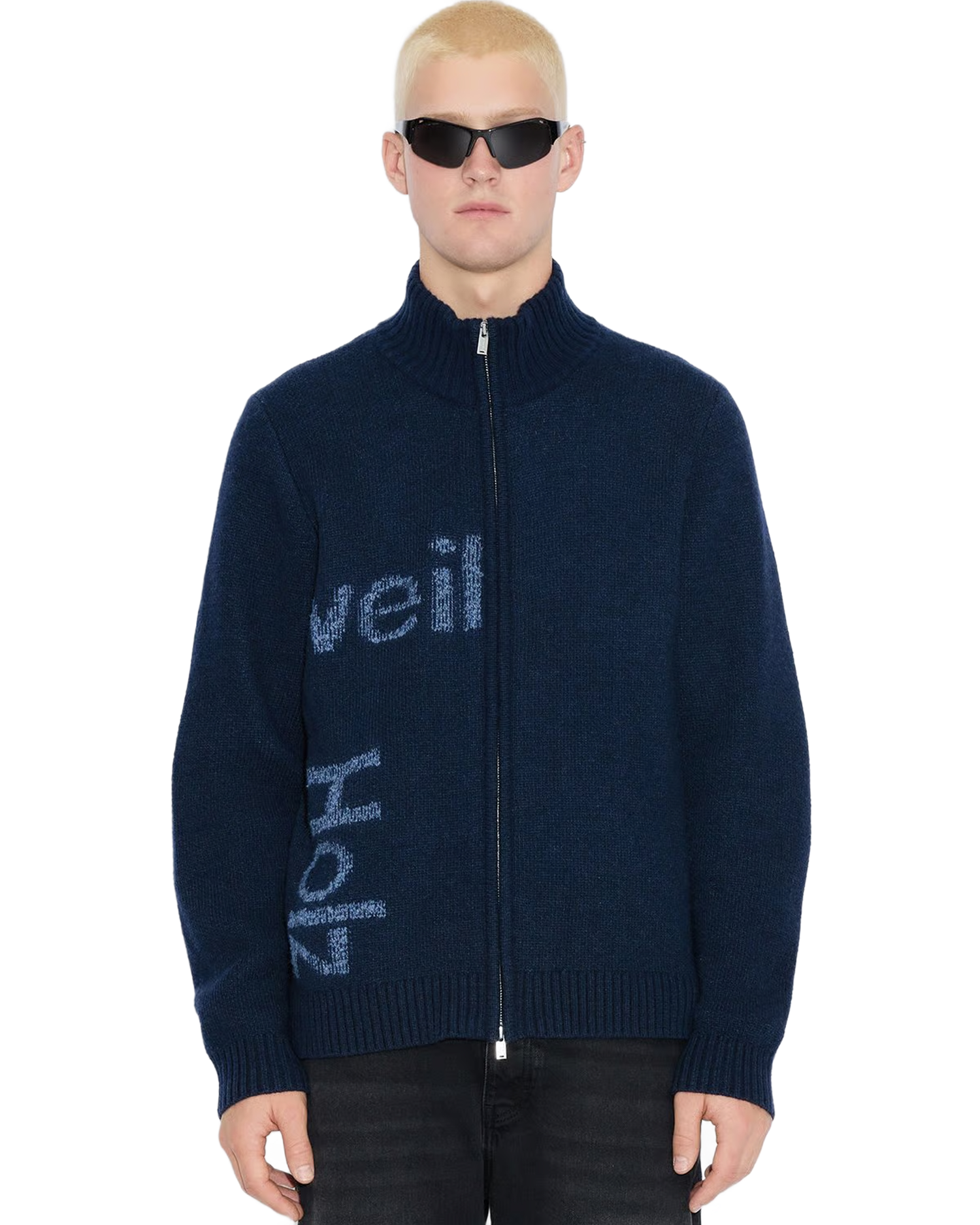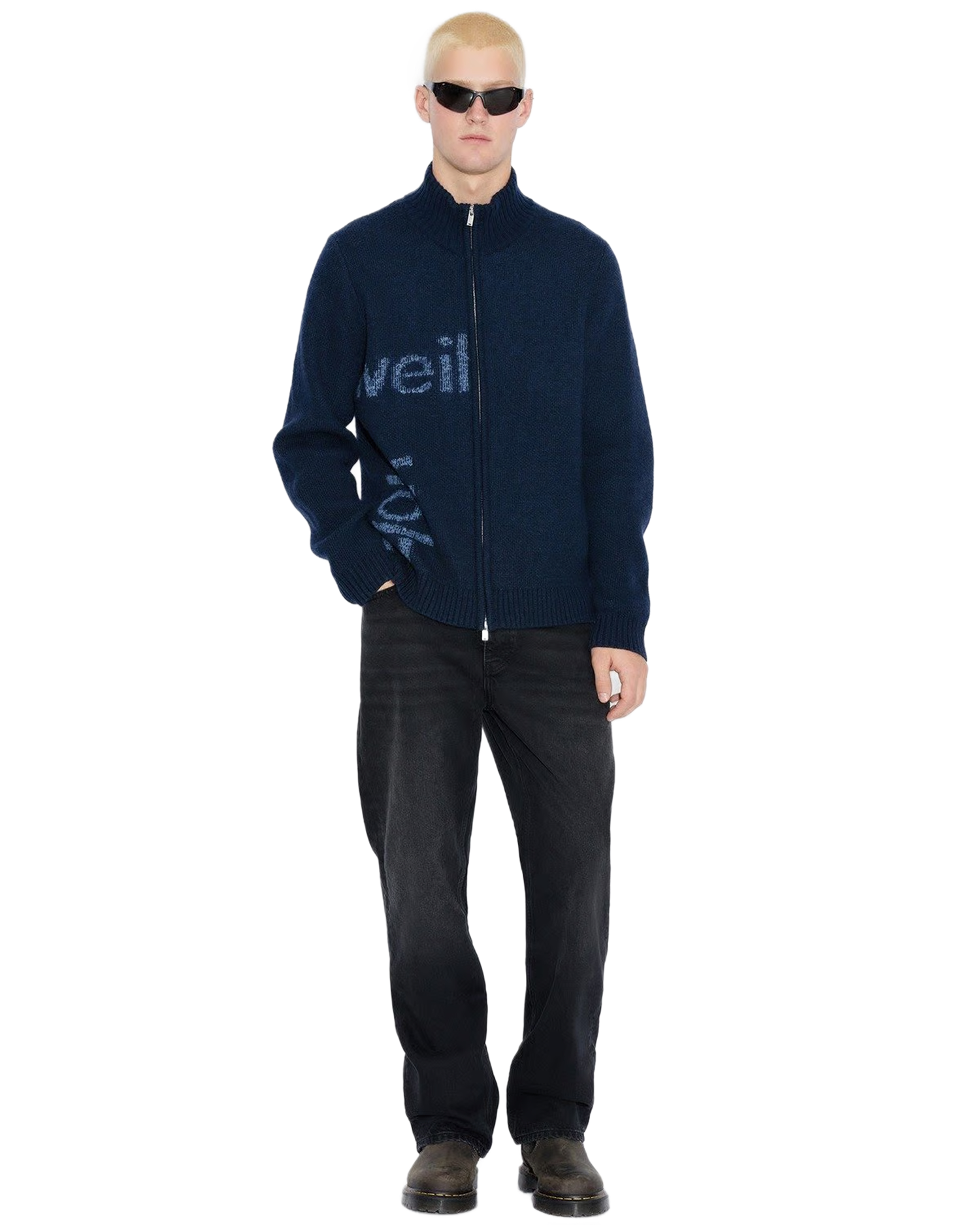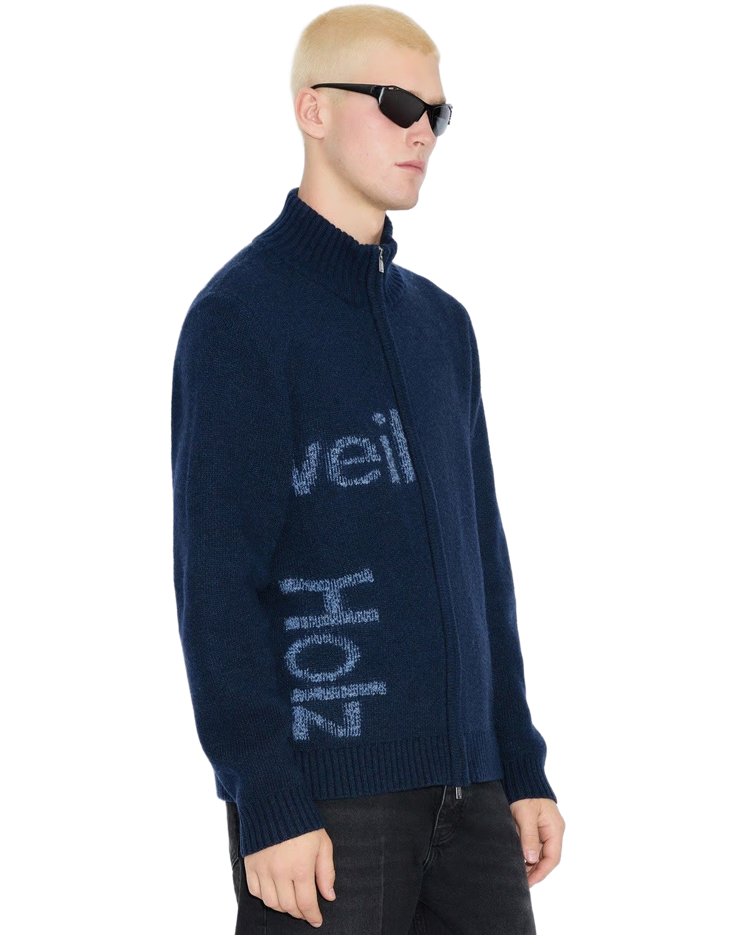 En avslappet strikkejakke med glidelås og høy hals, definert av både horisontale og vertikale logojacquard-detaljer — en kultivert og moderne cardigan med fokus på komfort og merkevareidentitet.
